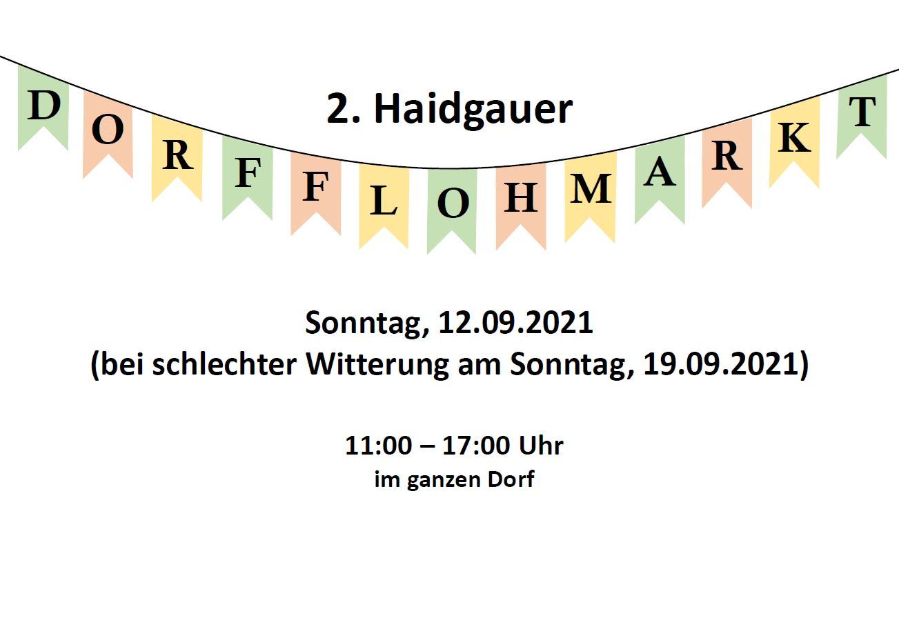 Der Dorfflohmarkt findet am Sonntag, den 12.09.2021 von 11 Uhr bis 17 Uhr, organisiert durch die SG Haidgau e.V., statt. Bei schlechtem Wetter wird der Flohmarkt um eine Woche verschoben, auf Sonntag, den 19.09.2021.