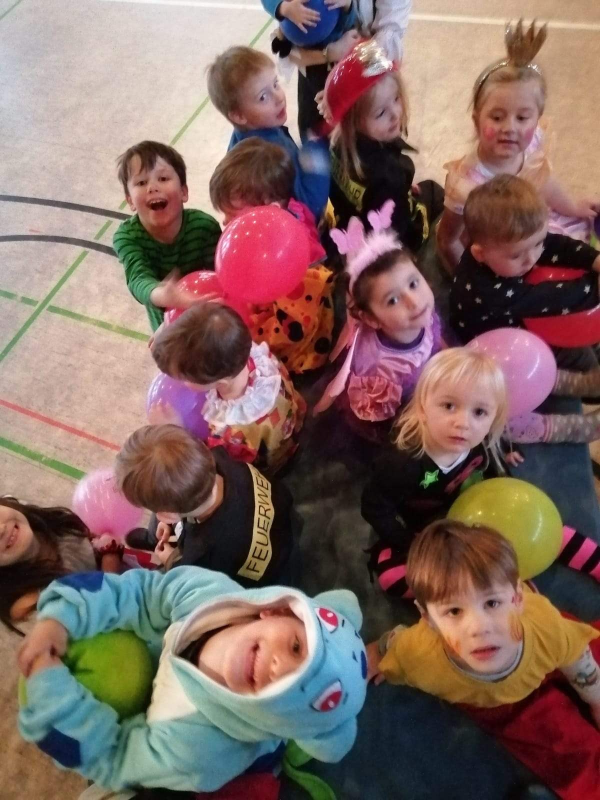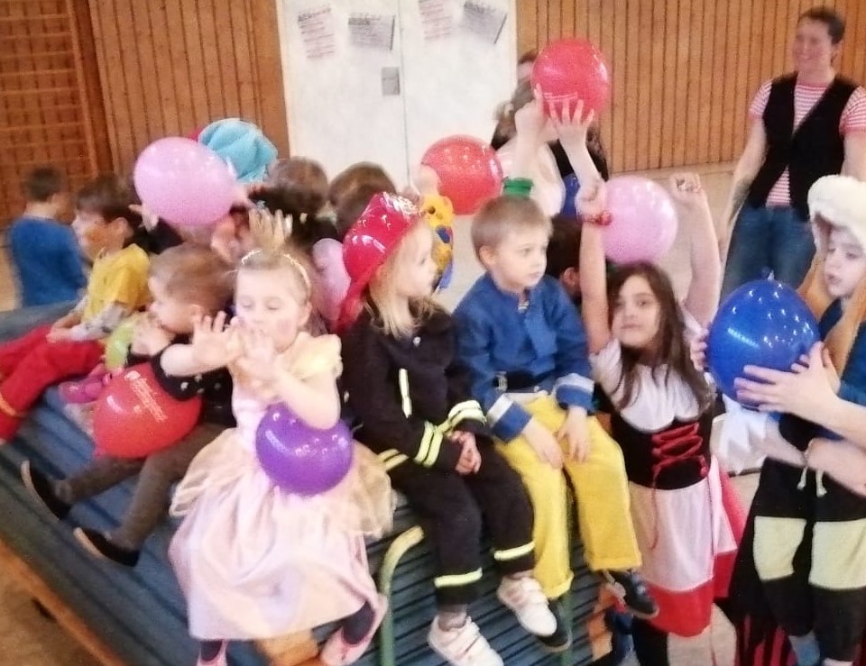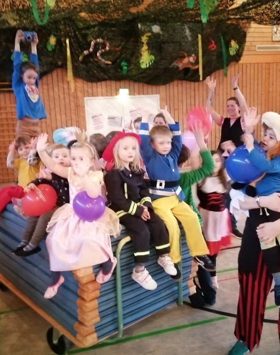 Auch in diesem Jahr wurde natürlich wieder Fasnet im Eltern-Kind-Turnen gefeiert. Die Kinder (und Eltern) durften verkleidet kommen und so trudelten nach und nach kleine Feuerwehrmänner und -frauen, Piraten, Prinzessinnen und vieles mehr in der Halle ein. Nach dem Begrüßungstanz gab es verschiedene Spiele und Übungen mit Luftballons für die Kinder. Besonders gut kamen die Schwungtuchspiele bei Klein und Groß an.