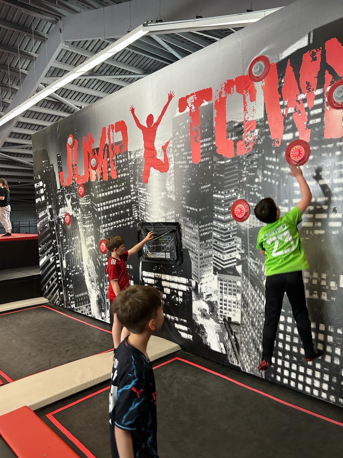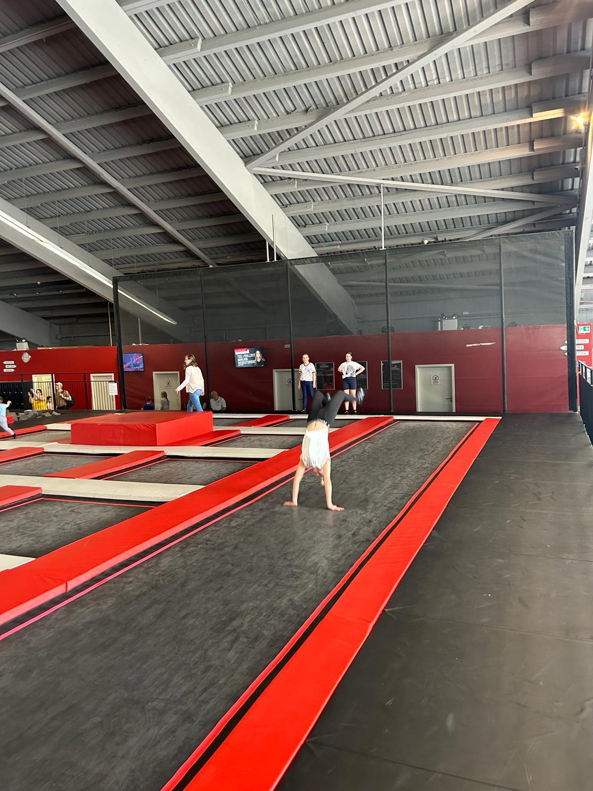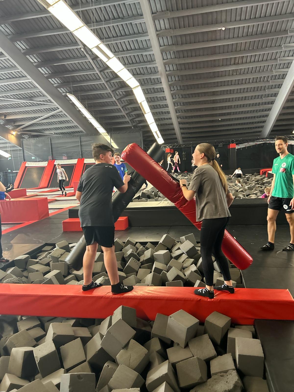 Dort angekommen schlüpften schnell alle in die rutschfesten Socken, sodass nach einer kurzen Einweisung der Sprungbereich der Halle erkundet werden konnte. Die vielen einzelnen Trampoline in verschiedenen Größen mit und ohne Hindernisse laden sofort zum Hüpfen und Springen ein. Insbesondere die mit Schaumstoffwürfel gefüllten Sprunggruben sorgten bei den Kids für große Begeisterung.