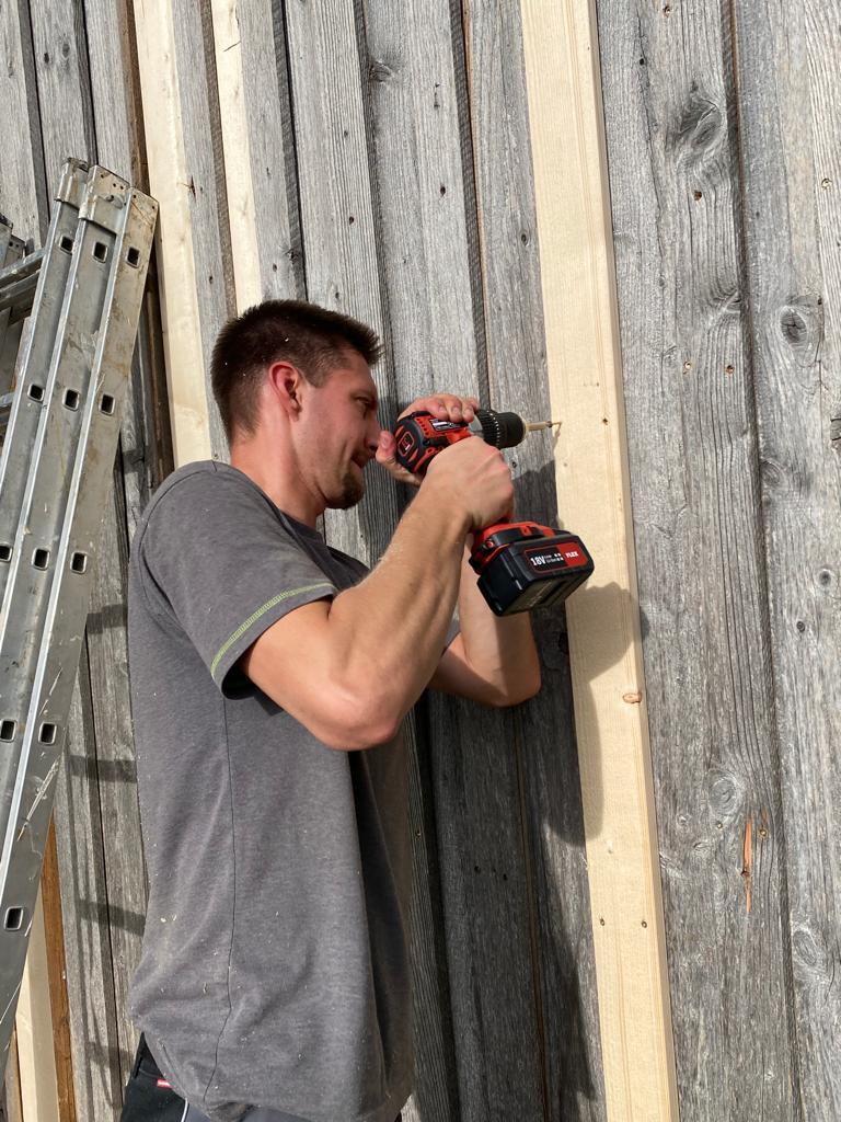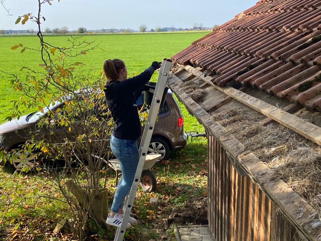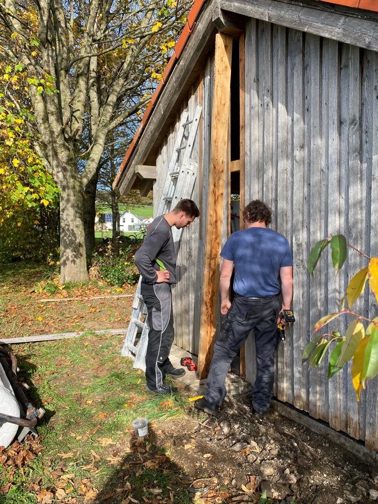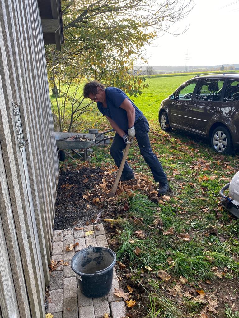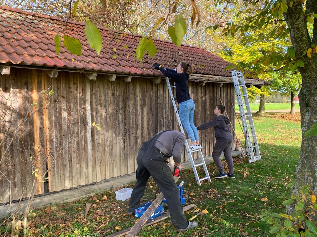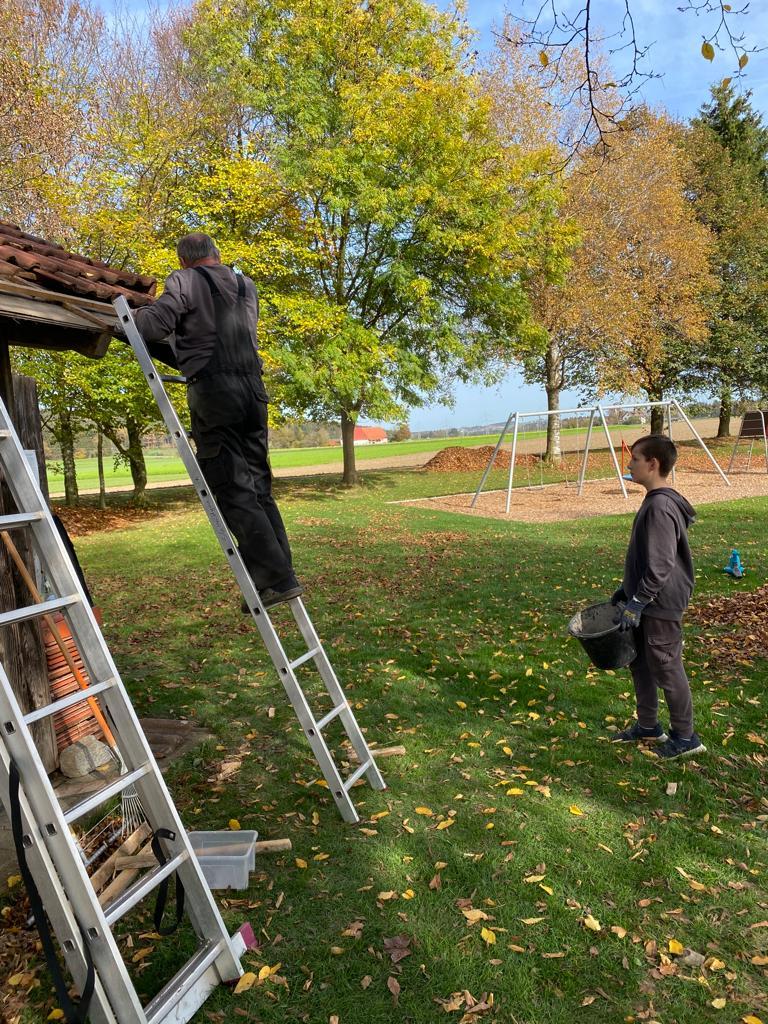 Es wurde Laub zu großen Haufen gerecht bzw. geblasen, defekte Bretter und Dachplatten am Schopf ausgetauscht sowie Sitzbretter an der Grillstelle erneuert.
