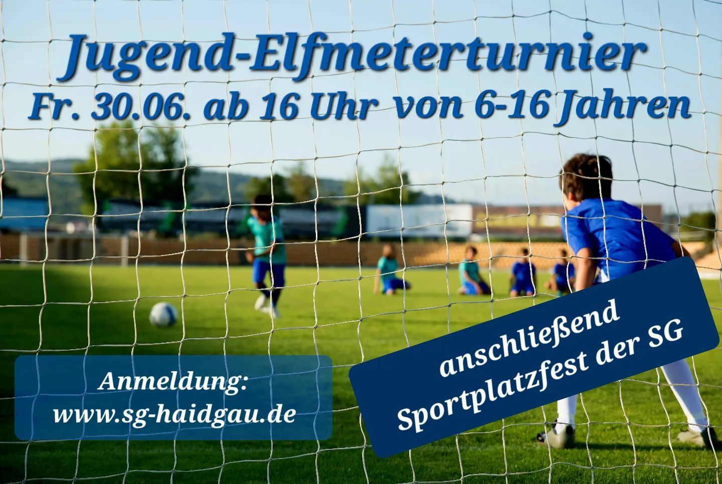 Nutzt die Chance und meldet euch jetzt noch zum Jugend-Elfmeterturnier der SG Haidgau an! Neben Ruhm und Ehre gibt es auch einen großen Pokal und viele Medaillen zu gewinnen. Anschließend wird auf dem Sportplatzfest gebührend gefeiert